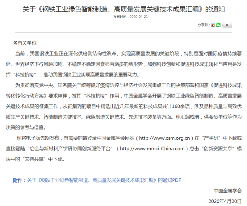 2020年4月21日,中國金屬學(xué)會(huì)發(fā)布了《鋼鐵工業(yè)綠色智能制造、高質(zhì)量發(fā)展關(guān)鍵技術(shù)成果匯編》,公司“清潔、高效、大型焦?fàn)t的應(yīng)用技術(shù)”、“焦化煤調(diào)濕技術(shù)及SDM-HB2干燥破碎機(jī)”、“一種高架式設(shè)計(jì)的熱連軋生產(chǎn)線”以及與山東墨龍石油機(jī)械有限公司聯(lián)合申報(bào)的“墨龍HIsmelt熔融還原工藝”共4項(xiàng)技術(shù)入選。