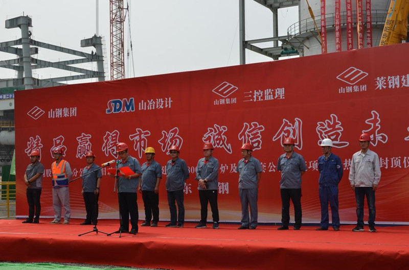 2020628950分,公司總包的山鋼股份萊蕪分公司新舊動能轉換項目13800m3高爐熱風爐順利封頂!山鋼股份萊蕪分公司新舊動能轉換項目工程指揮部副指揮孫建設,山鋼股份萊蕪分公司煉鐵廠經理、高爐工程項目經理部經理張明,新舊動能轉換項目工程指揮部高爐工程項目經理部常務副經理賈友劍,萊蕪三控冶金建設監理事務所經理沈桂聯,我公司黨委書記、副總經理谷卓奇,萊蕪鋼鐵集團建筑安裝工程有限公司黨委書記、董事長時元海,萊蕪鋼鐵集團建筑安裝工程有限公司副經理梁博,上海二十冶萊鋼高爐項目部項目經理李虎,中國十九冶萊鋼高爐公輔項目部項目副經理田澤龍,河北省安萊鋼高爐噴煤及鑄鐵機項目部項目經理王紅帥,中十冶萊鋼主控樓項目部項目經理馬少華出席了儀式。
