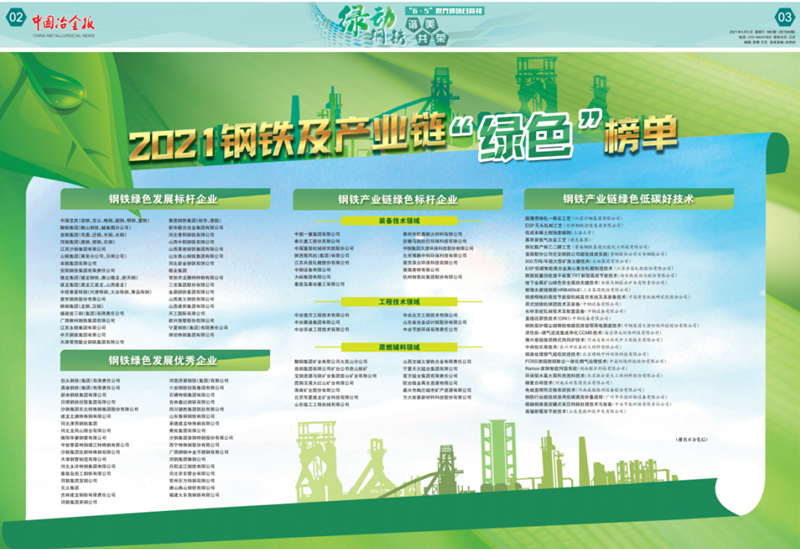 近期中國冶金報公布了2021年度中國鋼鐵品牌企業和2021年度鋼鐵及產業鏈“綠色”標桿企業,我公司雙雙上榜。510日,第5個中國品牌日,公布了2021中國鋼鐵品牌榜單,公司再次榮獲中國鋼鐵工程技術類“優秀品牌供應商”榮譽稱號,我公司已經連續兩年獲得中國鋼鐵工程技術類優秀品牌企業。65日,世界環境日,公布了2021鋼鐵及產業鏈“綠色”榜單,公司榮獲中國“鋼鐵產業鏈綠色標桿企業”稱號。