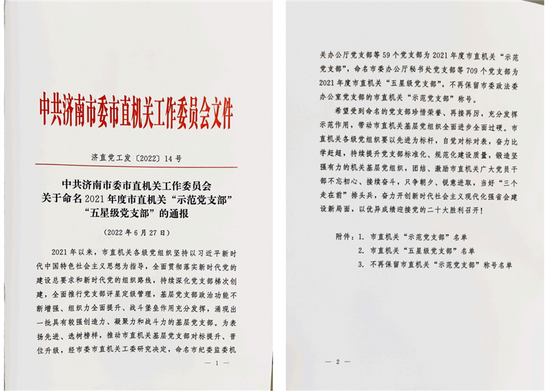 市委市直機關工委印發的《關于命名2021年度市直機關“示范黨支部”、“五星級黨支部”的通報》(濟直黨工發〔2022〕1號文)中,授予我單位熱風爐工程技術分公司黨支部、焦化事業部黨支部、耀華能源公司黨支部、土建設計一部黨支部、土建設計二部黨支部、職能管理第一黨支部、公司辦公室黨支部、電氣設計部黨支部、經營管理黨支部、職能管理第二黨支部共10個黨支部為“五星級黨支部”。獲獎支部將繼續發揮示范作用,團結激勵支部黨員,不忘初心、勇于擔當,努力為公司發展做出更大貢獻。